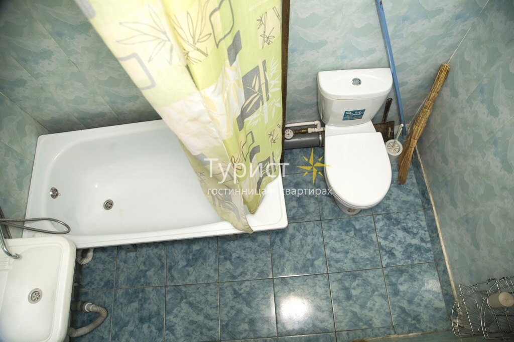 Кухня оформлена в ярком салатовом цвете и насчитывает все главные атрибуты, необходимые для готовки и приема пищи – шкафы и рабочие поверхности с посудой и столовыми приборами, электропечь, мягкий уголок, электрочайник, холодильник и печь СВЧ. Санузел совмещенный, но достаточно просторный и эргономично оформлен новой сантехникой и стиральной машиной.